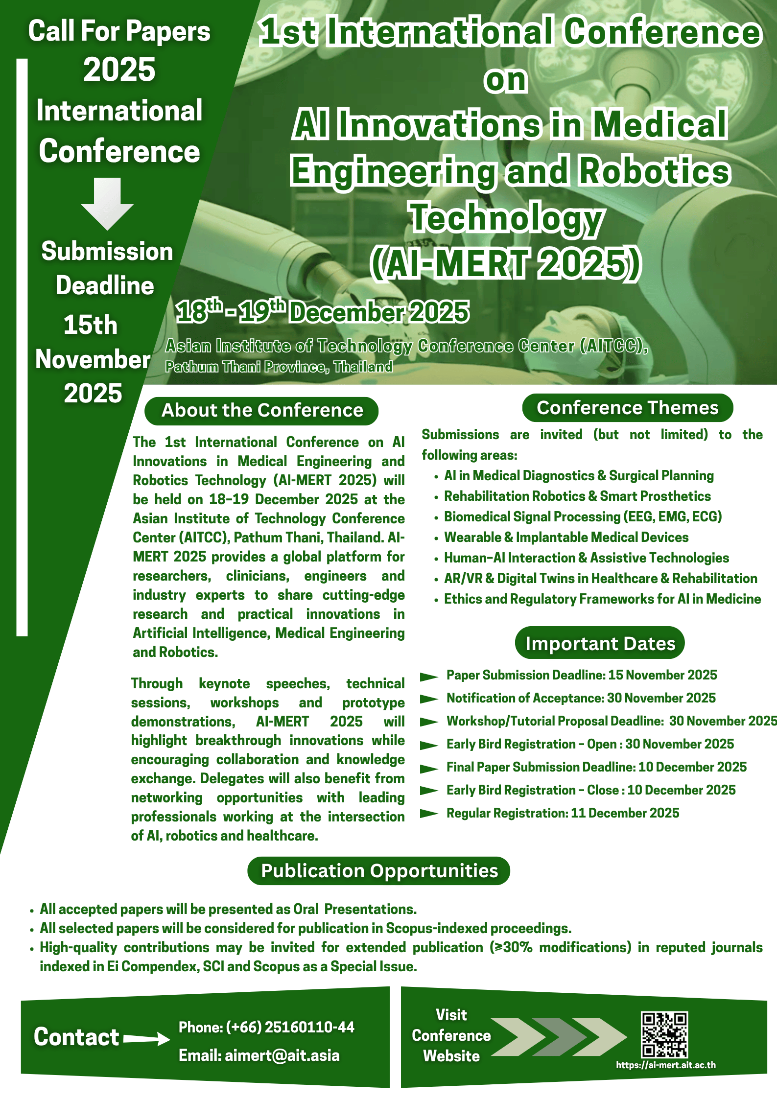 The 1st International Convention on AI Innovations in Medical Engineering and Robotics Technology (AI-MERT 2025) will take place on 18th, 19th December in AIT Conference Center, Asian Institute of Technology(AIT), Bangkok, Thailand.