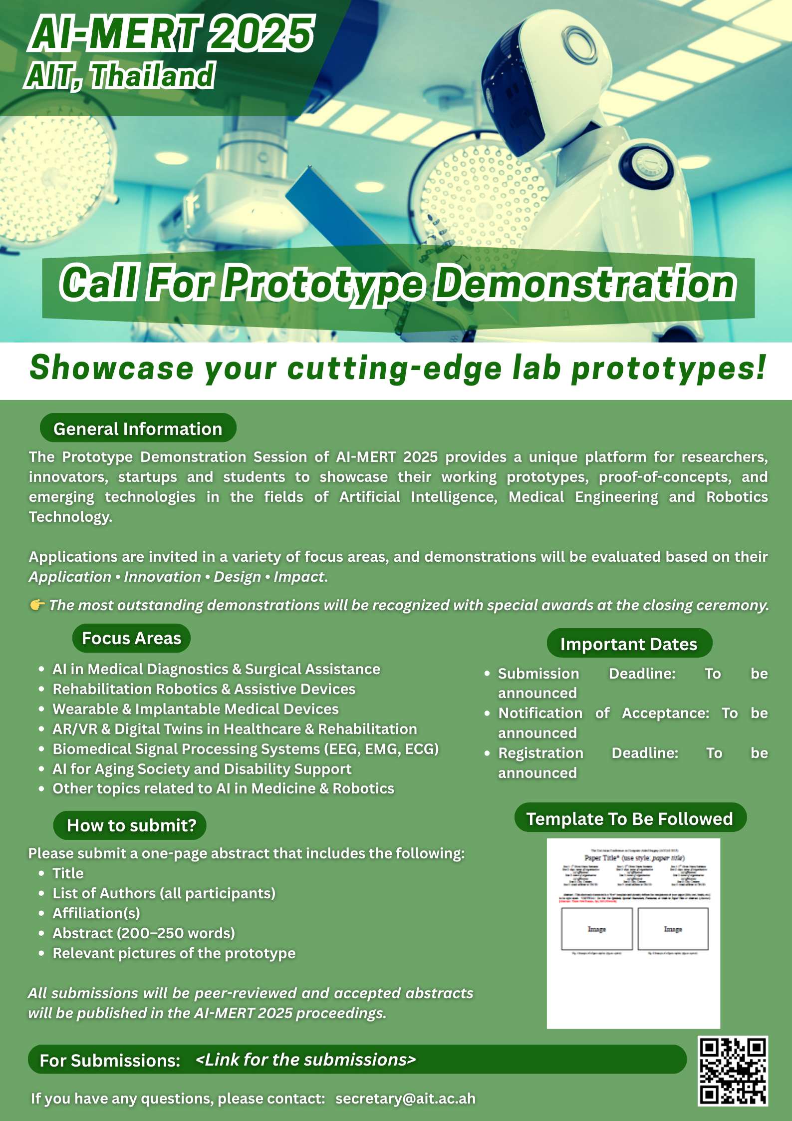 The 1st International Conference on AI Innovations in Medical Engineering and Robotics Technology (AI-MERT 2025) invites innovators, researchers, startups, and students to participate in the Prototype Demonstration Track.